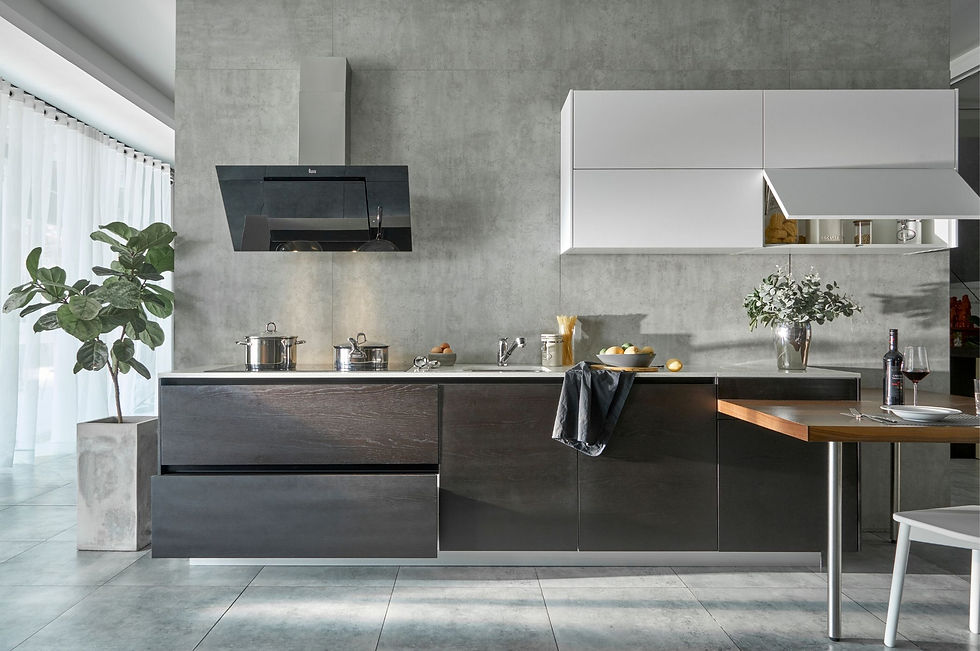 Nếu bạn đang làm việc với một không gian nhỏ thì tốt nhất là lựa chọn màu sắc sàn và tủ gỗ tương đồng để tạo ra một cái nhìn liền mạch mở rộng cho nhà bếp của bạn.