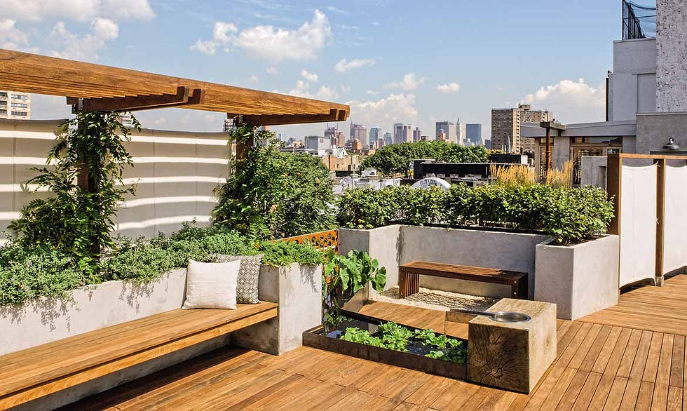 Khu vườn trên sân thượng với ghế băng, cây xanh và một góc view rất thoáng.
