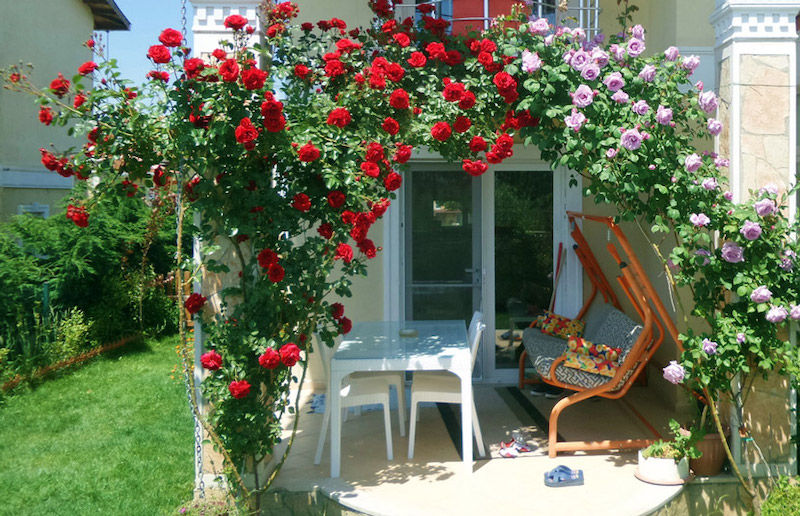 Có rất nhiều không gian nhà vườn lựa chọn và trồng hoa hồng leo, một loại cây hoa dễ chăm chút và mang đến nét lãng mạn cho khung cảnh. Hương thơm thoang thoảng của những bông hồng khoe sắc trong ánh nắng ban mai góp phần mang đến vẻ đẹp thanh lịch dịu dàng khi bước vào nhà.
