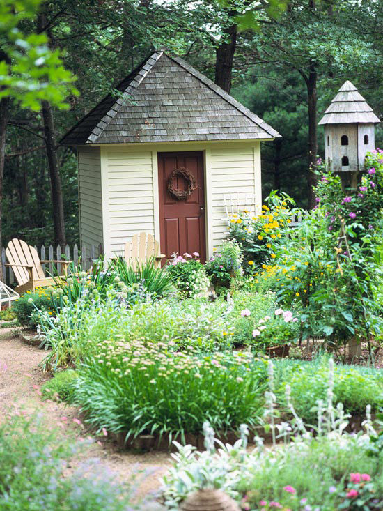 Nếu không có thời gian chăm chút cho “nhà kho” của mình, bạn vẫn có thể ghi điểm cộng trong mắt bạn bè với một thiết kế vô cùng đơn giản. Với không gian này, bạn nên dùng màu sơn nổi bật và đặt chúng ở một nơi thoáng nhất. Treo chiếc chuông gió ở cửa ra vào, trồng những rặng hoa nhỏ phía trước, bạn đã có một điểm dừng chân lý tưởng sau những giờ làm vườn hăng say.
