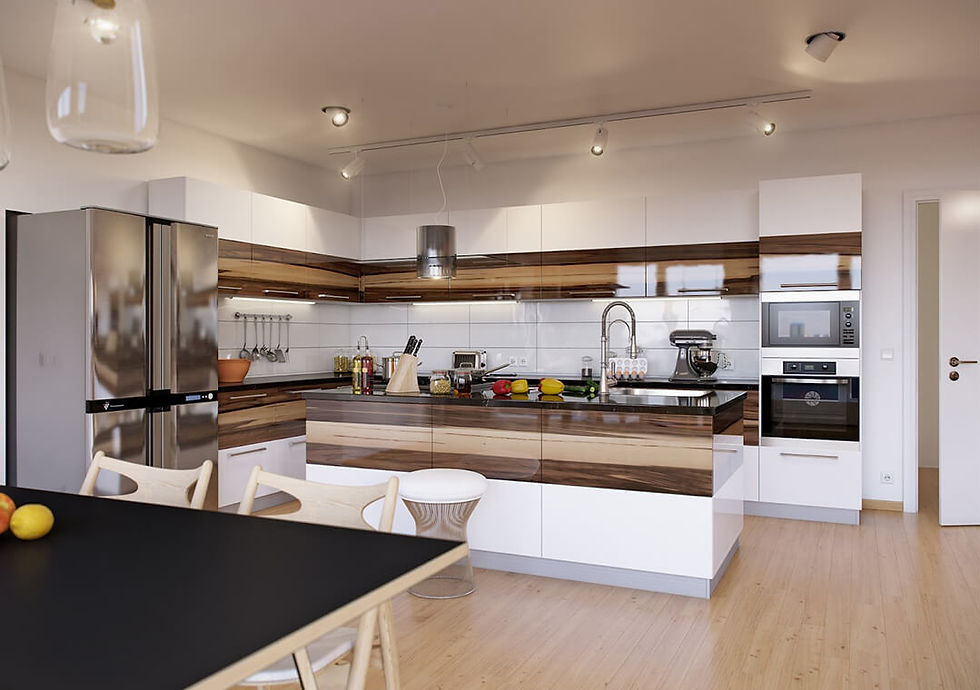 Ba vị trí quan trọng nhất trong phòng bếp đó là vị trí đặt tủ lạnh – bồn rửa bát – bếp nấu. Theo các nhà kiến trúc sư, thiết kế phòng bếp tốt nhất nên có dạng chữ U hoặc chữ L.