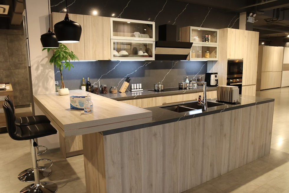 Nếu với cách bài trí bếp hình chữ U, gian nấu nướng nhà bạn vẫn bừa bộn bởi còn rất nhiều đồ đạc "vô gia cư". Bạn có thể đóng thêm chiếc tủ để thêm nơi lưu trữ cho chúng ở trong bếp. Và giải pháp đưa ra đó là căn bếp vuông vắn nhà bạn được bài trí theo hình "lòng bàn tay".