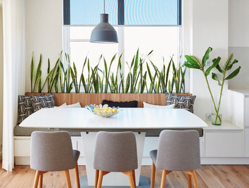 Đối với không gian bếp, có thể bố trí những cây nhỏ gọn, tránh vướng víu và có tác dụng khử mùi, giảm khói như dương xỉ. Phòng ăn nên đặt một số chậu cây có sắc màu vui tươi kích thích tiêu hoá ví dụ như tía tô cảnh, đỗ quyên, hoa lá đỏ.