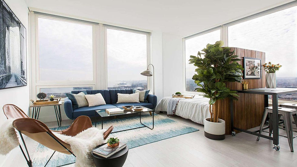 Vị trí trung tâm nhất ở mặt sàn được dùng làm phòng khách. Phòng khách này vốn bị vát do khổ đất có sẵn, do đó cặp vợ chồng đã kê một bộ sofa chữ L để tăng thêm sự vuông vức cho không gian. Đi kèm đó, góc tường vát được biến thành một cửa sổ, vừa giúp căn hộ sáng, vừa tăng tính thẩm mỹ mà còn phần nào giúp người ta quên mất khuyết điểm không vuông vức vốn có.